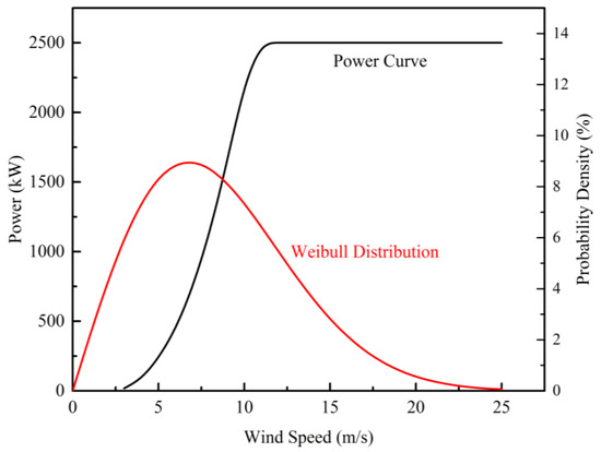 Power curve of AeroDyn 2.5 MW and Weibull wind speed distribution.