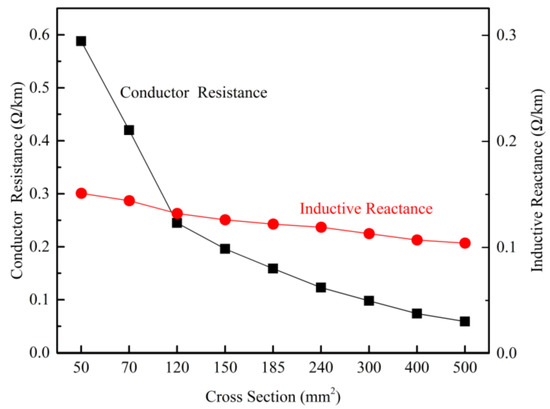 The medium-voltage and high-voltage power networks were constructed with 30 kV and 220 kV, respectively. The available cable contained eight cross-sectional areas (mm2) of 50, 70, 120, 150, 185, 240, 400, and 500, respectively. The cost and basic technical parameters of the cable were obtained from the reference [7]. The resistances and reactances of the cables as a function of the cross-sections are shown in Figure 5. In the literature, the price of the cable was denominated in Polish Zloty (PLN), which was converted to USD denominated (USD) at a rate of 1 PLN = 0.2625 USD. The power of the offshore substation was 75 MVA.