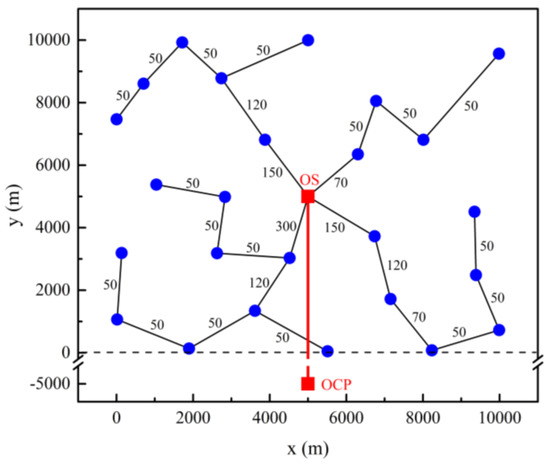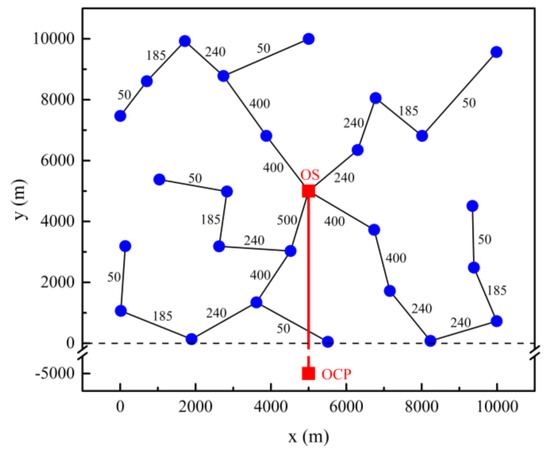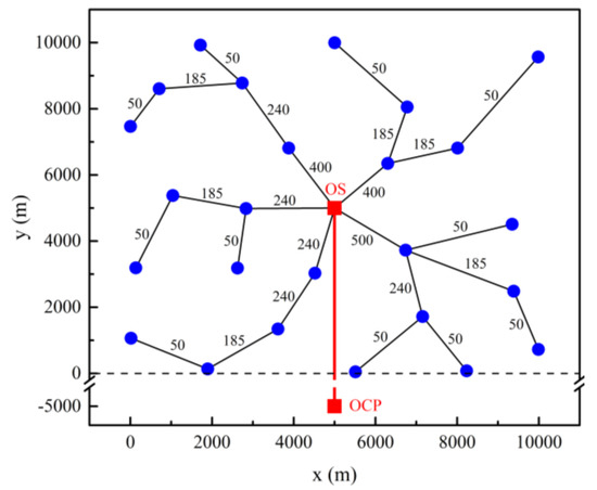 Currently, the design of the cable cross-section is based on the maximum current-carrying criterion [8,9,10]. This method of design is to determine the cable cross-section after the connection topology is obtained, according to the rule that the maximum current on each cable segment in the topology should not exceed the allowable current capacity of the cable. At the same time, the safety constraints such as the voltage drop [4] and the thermal stability [10] need to be strictly met. In the solution obtained according to the principle of maximum current carrying capacity, the cross-section of each cable segment in the topology should be the smallest, and this minimizes the cost of the cable. However, the resistance increases as the cross-sectional area of the cable decreases, resulting in greater power loss during the service life of the power system for at least 20 years. According to an earlier report [11], by properly employing the large cross-section cables on cable segments with large currents in the topology, the power loss caused by the resistors was found to be greatly reduced, thereby effectively improving the economics of the power system.