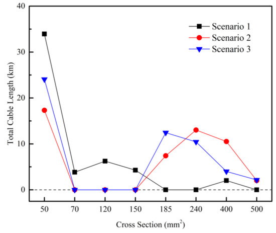 A total of three scenarios were set up for the optimization of the power system. Script 1 employs a traditional step-by-step design approach in which the connection topology was generated by the MST and then the cable cross-section was designed according to the principle of maximum current carrying capacity. Script 2 also used MST to generate a topology, but it optimized the cross-section of the cable. Script 3 performed a coupling optimization of topology and cable cross sections. All scripts are run for a maximum of 5000 function evaluations and converged to the final solutions after about 3500 generations. The optimal topology and cable cross section schemes obtained from the above three scripts are given in Figure 6, Figure 7 and Figure 8. The length comparison of the different cross-section cables used in the three script optimal solutions is shown in Figure 9. A comparison of the key economic parameters of the power systems is given in Table 1.