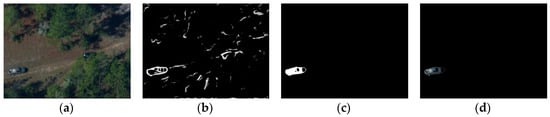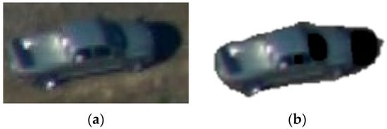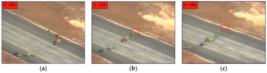 In real-world environments, many recent algorithms have achieved great success in visual-object tracking [24,25,26,27,28,29,30,31]. These algorithms were able to solve the problems of several types of appearance changes in the target, for instance, pose variations, occlusion, and illumination changes. However, if these changes are very extreme, most of the methods may fail to track the target. An example of false tracking caused by vehicle turning is shown in Figure 1. Test images are from the DARPA dataset’s video sequence “egtest03”.