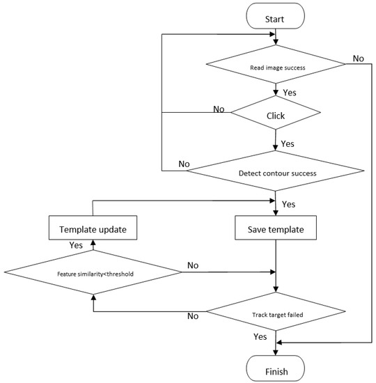 We propose utilizing our method in an intelligent real-time tracking system that can be remotely operated and monitored. In this system, images are taken in a timely manner by cameras on aircraft in the sky, and our targets are vehicles on land. Once the system is started, users can manually select the tracking target by clicking on it on the monitor screen. Then, the system automatically learns which object to track by detecting contours and abstracting semantic information according to the position of the initial point. After extracting target features, our system begins to track targets through features in the following frames and saves target features as a high-confidence template. If the similarity between template and tracking object is smaller than a threshold due to target deformation or occlusion, which suggests that the initial template is not able to precisely match object features in the current frame, our system updates the template with strategies that are discussed further down. While the tracker fails or finishes processing all images in a video sequence, the system finishes its task as well. A brief flowchart of the whole system is shown in Figure 3.