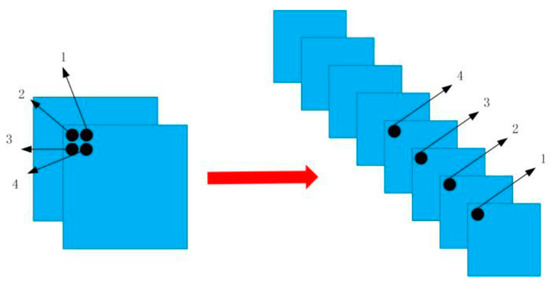 The “passthrough module” was added to combine target location information in the lower layers and semantic information in the higher layers. To be specific, the features of the lower layers contained more fine-grained information, which helps to locate small targets. Therefore, we used a passthrough layer with stride 2 that transformed the feature map from 2N × 2N × C to N × N × 4C. The function of the passthrough layer is explained in Figure 6.