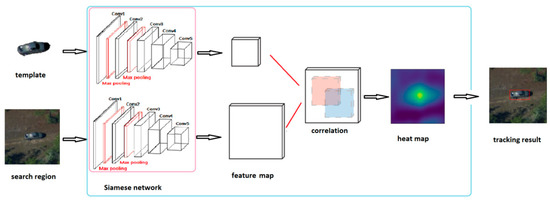 Figure 9 shows the architecture of our Siamese tracking network: First, the full convolutional network takes template and search area as inputs, respectively, and outputs features for the template and search area. Then, the heat map is generated through correlation of the similarity between template and search-area features. Last but not least, the target is tracked in the search area according to the highest response on the heat map.