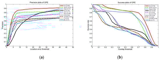 Results of different trackers on vehicle videos in OTB100: (a) one-pass evaluation (OPE) precision plots; (b) OPE success plots.