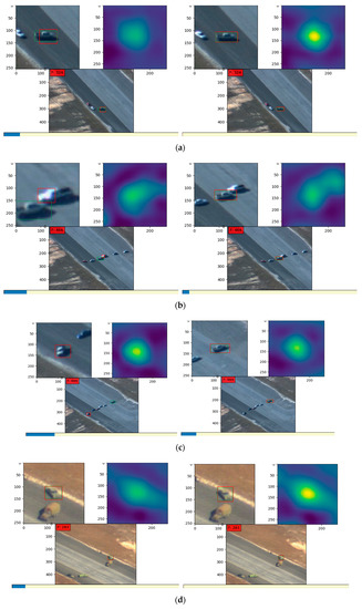 Figure 11 are the results of two different sequences of video images from the DARPA dataset. To be specific, images in Figure 11a–c are from video sequence “egtest02”, and images in Figure 11d–f are from video sequence “egtest03”. In Figure 11a,d, both of the tracking vehicles were making a turn and this lead to target deformation. These appearance changes could not match previous templates with high similarities according to the heat maps. As a result, the left images in Figure 11b,c,e,f show that the tracker without template-updating failed to track the target, while the right images in the corresponding group prove that our latest method was able to solve the problem through template updating.