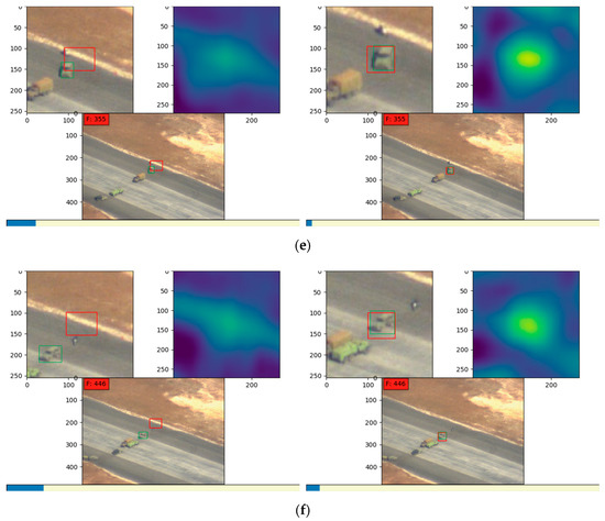Results on images in datasets taken by the Defense Advanced Research Projects Agency (DARPA): (a–f) are six groups of comparison results on the DARPA dataset between the Siamese tracking methods without or with adaptive template-updating strategy. Bottom image in each group, tracking result in origin frame; top left, cropped image showing partial enlarged detail of tracking result; top right, corresponding heat map denoting similarity. Green boxes, ground truth; red, tracking results.