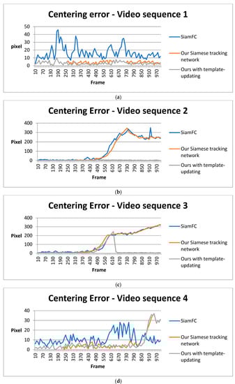 We calibrated and recorded the result deviations of SiamFC, our Siamese tracking network, and our Siamese tracking network with a template-updating strategy, respectively. In this set of experiments, we only compared the centering error of the different methods in each video sequence because, in our application, center precision was the most significant and could have had serious consequences. We calculated the centering error between the tracking results and the calibrated ground-truth centers every 10 frames for the three different methods, outlined in Figure 12. It is worth noting that the target size in the first four video sequences was about 20 to 40 pixels, and in the video sequence, 5 was about 100 pixels. In most frames, the central error of our method was less than 10 pixels. This deviation could be tolerated as long as the detected target center was still in the actual target location. When faced with challenges such as occlusion or deformation, our Siamese tracking with adaptive template-updating strategy had the least mistakes during the tracking process. The success of updating templates in our latest method generated some spikes that can be seen in the results of video sequences 3 and 5. Overall, the average centering error of our latest method was much lower than that of the others.