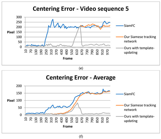 Statistical results of SiamFC, our Siamese tracking network, and our Siamese tracking network with template-updating strategy: (a–e) centering error of three methods in five different video sequences and (f) average centering error.