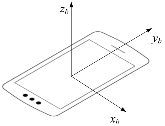 The accelerometer, that measure specific force, can be used to obtain roll and pitch, and the heading can be solved by the leveled magnetic field intensity that is obtained by using roll and pitch. Many references discuss the solution of roll and pitch using acceleration, so we mainly discuss the heading calculated by magnetometer in this section. In this paper, the smartphone axis is show in Figure 1.