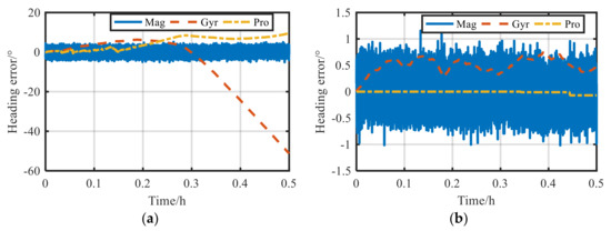 Figure 2 shows the heading error of different methods. The solid line is the error of heading calculated by magnetometer (Mag), and we can see that the margin of error is about 5 degrees even though the data are static in Figure 2a, and the jump range of error is 1 degree for XM8 in Figure 2b. The dashed line is the error of heading obtained by gyroscope (Gyr). The error is low and smooth in the short term, but it gradually accumulates with time, and the maximum error reaches 50 degrees for HV9. The chain line expresses the error of heading estimated by the proposed method that the AKF based on AR is used to estimate heading (ProA). We can see from Figure 2 that the drift error of heading is effectively contained by the proposed algorithm compared with the method of Gyr. Compare with the method of Mag, the error is smooth and accurate for XM8, however, the result of Pro is worse than that of Mag for HV9 with time. We can see from Equation (32) that the accuracy of a heading calculated by Gyr will affect the result of ProA, so the accuracy of ProA is affected by the cumulative error of Gyr in Figure 2a. Comparing Figure 2a and Figure 2b, we found that the heading calculated by XM8 is better than that estimated by HV9. That’s because the sensors accuracy of XM8 are better than that of HV9.
