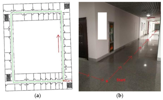 Trajectory of experiment: (a) Floor plan; (b) Experimental environment.