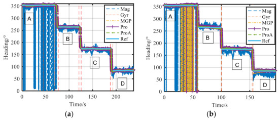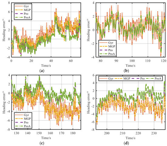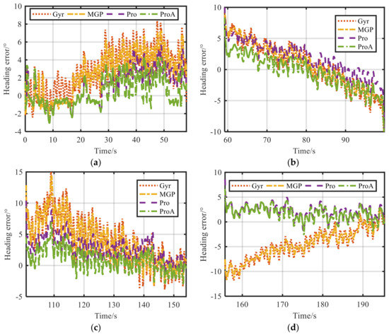 Figure 6 shows local heading error of Figure 4b. In Figure 6a, most errors of Pro and ProA are within 4°, and these errors are smaller than those of Gyr and MGP. In Figure 6b–d, these errors of Pro and ProA are principally less than 5°, and these results of Pro and ProA are superior to those of Gyr and MGP. In Table 2, The RMS of MGP is slightly smaller than that of Gyr, and the mean RMS is decreased by 1.97%. For these two kinematic experiments, the accuracy of heading estimation for MGP is better than that of Gyr, and this conclusion is consistent with that of the literature [22]. We can also see from Table 2 that these accuracies of Pro are better than those of MGP in these four sections. The RMS decrease from 3.45° to 2.25° in the local trajectory of mark A, the RMS drops from 3.66° to 3.28° in the local trajectory of mark B, the RMS reduces from 5.35° to 3.39° in the local trajectory of mark C, and the RMS decreases from 5.51° to 2.58° in the local trajectory of mark D. Compared with the mean accuracy of MGP, the mean accuracy of Pro increases by 35.86%. In Table 2, the accuracy of heading estimation is further improved by the adaptive algorithm. The RMS decreases from 2.25° to 1.70° in the local trajectory of mark A, the RMS drops from 3.28° to 2.69° in the local trajectory of mark B, the RMS reduces from 3.39° to 2.02° in the local trajectory of mark C, and the RMS decreases from 2.58° to 2.19° in the local trajectory of mark D. Also, the mean of RMS is improved by 25.35% for this kinematic data. Similarly, the biased heading estimation can be observed in Table 2, and the bias of mean for ProA is the smallest among these methods. Compared with these methods of Mag, Gyr and MGP, these methods of Pro and ProA can obtain the higher accuracy of heading estimation.