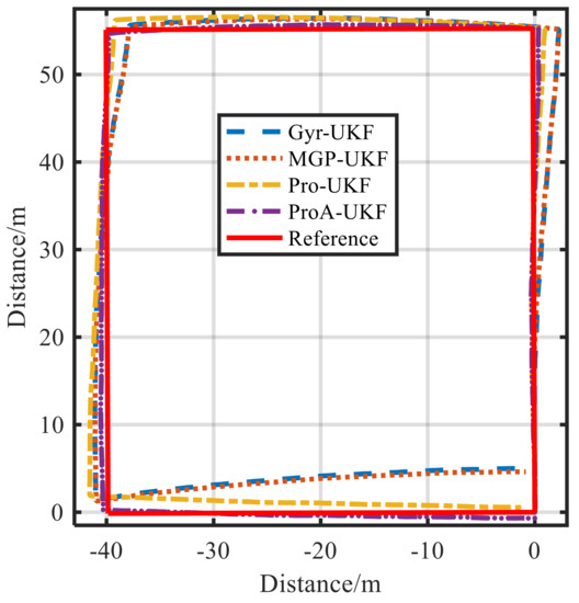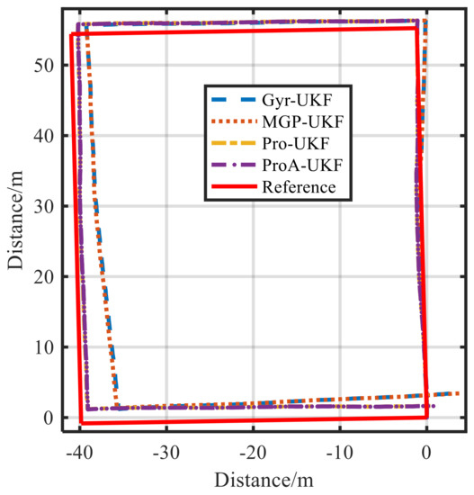 Figure 7 shows the position trajectories calculated by the outputs of the HV9. We can see from Figure 7 that these position trajectories of Gyr-UKF and MGP-UKF deviate from the reference with time, and the results of position estimation for these two methods are almost identical. The trajectory is improved by the method of Pro-UKF, and the position trajectory of ProA-UKF is basically the same as that of Pro-UKF. Figure 8 shows these trajectories obtained by XM8. We can see that these trajectories of Gyr-UKF and MGP-UKF deviate from the reference with time, and the trajectory of MGP-UKF is slighter better than that of Gyr-UKF. The trajectory is improved by the method of Pro-UKF, and the trajectory is further improved when ProA is used to estimate heading. Therefore, the trajectory calculated by a ProA-UKF algorithm is more accurate than that obtained by the other three methods.