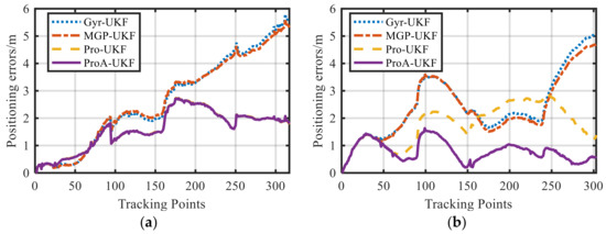 In order to provide a reference at each step, these timestamps were recorded when the tester passed corners, and the coordinates of these corners can be obtained by the reference trajectory and reference heading. The coordinates of each step between these two corners can be calculated by linear interpolation in time. In order to accurately analyze the heading, the step-length error is ignored here. Figure 9 shows the 2D position error of each step using HV9 and XM8. Figure 9a shows the position error of HV9. When the method of Gyr-UKF and MGP-UKF is used, the position error gradually accumulates with the walking distance, and the maximum error exceeds 5.5 m. The estimated position of MGP-UKF is slightly better than that of Gyr-UKF. The position error is improved by the Pro-UKF, and the maximum error is less than 2.8 m. We can also see that the position error of ProA-UKF is slightly smaller than that of Pro-UKF. Figure 9b is the position error of XM8 for different methods. The position error deviates from the reference with time when the Gyr-UKF is used, and the maximum error is over 5.0 m. The position estimation is slightly improved when MGP-UKF is used. The position errors are effectively constrained when the proposed algorithm of Pro-UKF is used, and the maximum error is less than 3.0 m. The position errors are further improved if the adaptive algorithm is used to estimate the heading, and the maximum error is less than 2.0 m. In Figure 9b, the positions accuracy of Pro-UKF is worse than those of Gyr-UKF and MGP-UKF at times. We can see from Figure 6c that the heading error is mostly positive for Pro, that will make the error accumulate, and the heading errors have positive and negative values for Gyr and MGP that will offset the error accumulation.