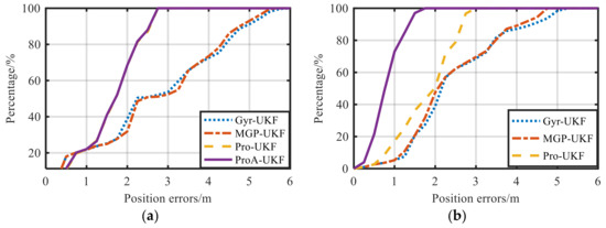 The corresponding position cumulative error estimation percentages (CEF) of Figure 9 is explained in Figure 10. In Figure 10a, the CEF within 1.5 m is 24.92% and 25.24% for Gyr-UKF and MGP-UKF, respectively, and the CEF is raised to 40.38% and 41.01% for Pro-UKF and ProA-UKF, respectively. The CEF within 2 m are 38.80% and 31.86% for Gyr-UKF and MGP-UKF, respectively. The CEF is increased to 68.45% for both Pro-UKF and ProA-UKF. When the CEF is about 75%, the position error is over 4 m for Gyr-UKF and MGP-UKF, and the position error is less than 2.25 m for Pro-UKF and ProA-UKF. For HV9, the proposed method can enhance the accuracy of position estimation. Figure 10b shows the CEF of XM8. In Figure 10b, the CEF within 1.5 m is just 20.79% for both Gyr-UKF and MGP-UKF, the CEF achieves 36.30% for Pro-UKF, and the CEF is, as expected, increased to 97.03% for ProA-UKF. When the position error is within 2 m, the CEF is 38.94% and 47.52% for Gyr-UKF and MGP-UKF, respectively, and the CEF is slight improved for Pro-UKF with 50.50%, however, the CEF is raised to 100% when the ProA-UKF is used. When the CEF is about 75%, the position errors are both over 3.25 m for Gyr-UKF and MGP-UKF, the error is within 2.50 m for Pro-UKF, and the error is less than 1.25 m for ProA-UKF. Therefore, we can obtain the conclusion that the proposed algorithm can improves the accuracy of heading estimation for smartphone.