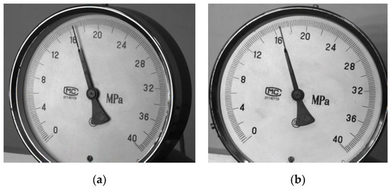 Second, normal vector of the meter surface was calculated by the camera coordinates of three midpoints to obtain the rotation transformation matrix of the meter image based on Equation (2). The meter image was rotated by the matrix to make the meter image parallel to the surface of the meter. Therefore, the pixel coordinates of the critical point (including the rotation center and the endpoint of the pointer) of the meter on the left in the image can be corrected in this way, identifying the readings of the meter on the left in the image by Equation (4). Through the translation distance D, the reading of the pointer meter on the right in the image can also be detected, as shown in Figure 8b.