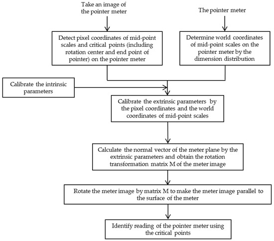 The present method for measuring readings of the pointer meter is shown in Figure 2. The camera intrinsic parameters A are calibrated by the Zhang [19] in the Appendix for the detail. For obtaining the extrinsic parameters, Xw–Yw coordinate plane of a World Coordinate System (WCS) is established on the meter surface, direction of the Xw-axis is parallel to connection line from center of the pointer rotation to the starting scale, the Zw axis perpendicular to the meter surface, and origin of the World Coordinate System is at center of the pointer rotation. Radii of circular arc of the scale distribution and center angles corresponding to the distribution can be determined by manually measuring the dimension distribution of the meter scales. So, world coordinates of midpoint on every short scale can be calculated by the radius and angles as: