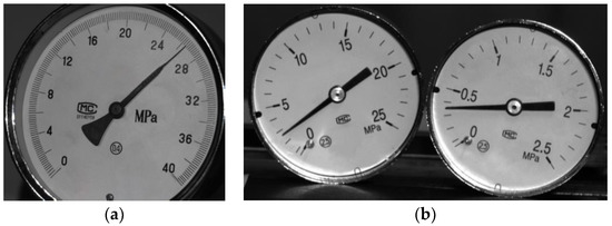 The pointer meter used in the experiment was a 0 to 40 MPa pressure gauge with a precision of , and the pointer meter’s maximum allowable absolute error was . The range accuracy of the meter reached 2 digits after the decimal point. In order to make the accuracy of the meter recognition algorithm reach the accuracy of the meter range, this paper kept the effective digit to the next digit of the precision. The pixel coordinates of mid-point scales were achieved using the sub-pixel detection method to improve the measurement resolution. In the experiment, the image of the pointer meter was 1292 × 964 pixels captured by a camera. We estimated the arc length pixel by calculating the distance between center points of two adjacent scales, and the radius of the pointer meter region pixel can also be calculated. Then, the angle was converted from the arc length. And the angle occupied by each pixel was 0.15°. Therefore, the camera’s hardware resolution was 0.15° under this experimental condition which includes strength of illumination and the distance m between camera and measured meter plane.