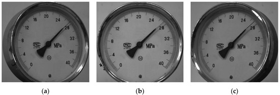 Under the same conditions, the three operators sequentially observed the same location of the pointer and recorded the readings of the pointer meter. Average value of the readings was used as the reference value for assessing the repeatability of the present method. Then, under keeping that the pointer location was the same with the operators observing, images of the pointer meter were taken from three different angles, as shown in Figure 5, and reading of the pointer meter was measured by the present method and the conventional method [25]. In Appendix B, the images of the pointer meter taken from three different angles were given for all the location of the pointer in the measurement.