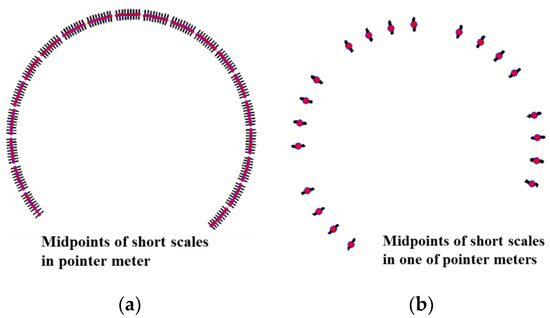 (a) Result of all the midpoints of short scales in the pointer meter with radius of 620 mm; (b) result of all the midpoints of short scales of the meter on the left in the image with radius of 406 mm.