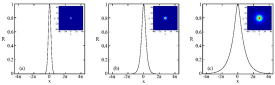 The response of nonlinearity, R, when (a) the degree of nonlocality (d) = 0.05, (b) d = 0.5, and (c) d = 5. In these figures, x refers to the horizontal coordinates. The insets of each picture are the corresponding transverse profiles of R. The amplitude of each R is normalized.