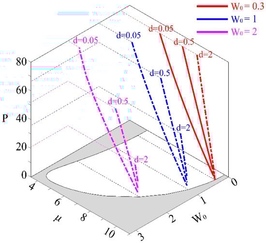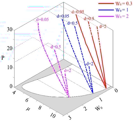 The power curves of six-pole solitons in PT-symmetric triangular lattices with different d and W0. The gray area in the μ–W0 plane is the optical energy band of the triangular lattices, and the white area is the first bandgap. The solid lines correspond to the stable solitons, while the dashed lines correspond to the unstable ones.