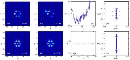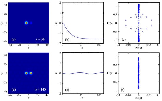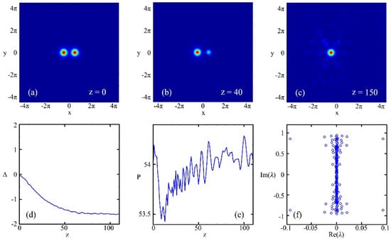 As for the unstable dipole solitons, we consider the dipole soliton with , as shown in Figure 4. The profiles of this soliton at are plotted in Figure 4a–c, respectively. One hump of this dipole soliton decays quickly (before ), and another hump can maintain its profile over a long distance (z). From Figure 4d, it is obvious that the gravity center shifts from (0, 0) to (−π, 0), which means the right hump whose original position is (π, 0) decays at the beginning of propagation and the power finally concentrates in the left hump. However, the power of this dipole soliton fluctuates violently during propagation, as shown in Figure 4e, which indicates this soliton is strongly unstable. The spectrum of is plotted in Figure 4f, demonstrating the linear instability of this dipole soliton. The maximum of the real part of is .
