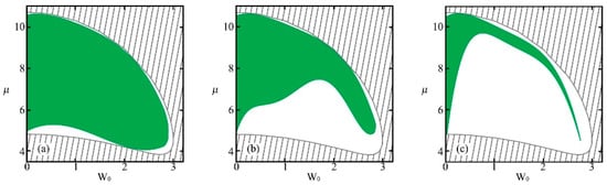 In general, fewer multipole solitons can exist in the first gap with a larger degree of gain/loss, , as Figure 2 shows. To investigate the influence of on the existence of multipole solitons, we calculate the maximum and minimum of propagation constants, , under which dipole solitons can exist with different . Three types of nonlocalities are considered separately, as shown in Figure 6. The green areas represent that dipole solitons can be found if their parameters are in these areas, and the shaded areas represent the optical energy band for linear optical modes where solitons cannot be found. With the weak nonlocality (), dipole solitons exist in almost the whole first bandgap, as shown in Figure 6a. As the nonlocality becomes stronger, the existence range becomes narrower. With strong nonlocality (), dipole solitons can only be found near the edge of the upper optical energy band, as shown in Figure 6c.