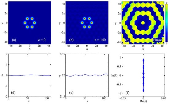 The six-pole soliton with is stable enough to propagate in the PT-symmetric triangular lattices. The profiles of this soliton at and are shown in Figure 8a,b, the structures of which are regular hexagons. The phase structure is plotted in Figure 8c, indicating its six humps are in-phase. We simulate the propagation of this soliton and calculate its gravity center and power in every step. The results are shown in Figure 8d,e. The transverse power distribution of this soliton is quite uniform, and thus the gravity center is almost at its original position. However, this six-pole soliton cannot maintain its profile after . This is because the nonlinearity will cause the oscillation of soliton power and increase the power catastrophically at a long distance. The result of linear stability analysis is plotted in Figure 8f. is zero, demonstrating this six-pole soliton is linearly stable.