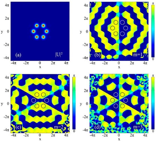 The profile and the phase structures of vortex solitons with different topological charges. (a) is their profile , i.e., square of modules of soliton solution . (b–d) correspond to the phase structures of vortex solitons with . m = topological charges.