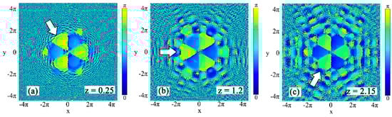 The phase structure evolution of vortex solitons with . (a–c) correspond to the phase structures of vortex solitons with . The arrows point to the phases of one specific peak.