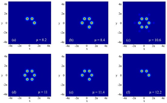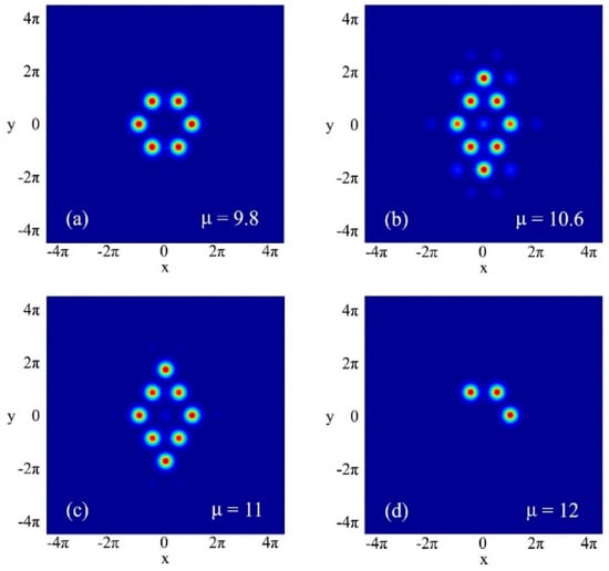 As for the vortex solitons with , the evolution of their profiles is similar to that of the vortex solitons with . To investigate the influence of the nonlocality, we consider the vortex solitons under strong nonlocal nonlinearity () with , which are shown in Figure 13. For the vortex solitons near the edge of bandgap, additional humps are generated, as shown in Figure 13b,c. Their profiles turn into diamond shapes. When the vortex soliton is far from the edge of the bandgap, the profiles are complete (six poles arranged symmetrically around a circle) and then become incomplete, as shown in Figure 13a,d.