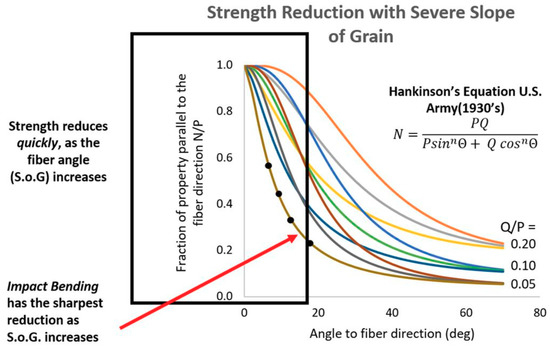 where N is the strength at an angle θ to the fiber direction, P is the strength perpendicular to the fiber, Q is the strength parallel to the fiber, and n is an empirically determined constant [10]. Different properties follow different curves (Figure 4), and these curves are average relationships developed across many species. The Wood Handbook states that the modulus of rupture (MOR) falls very close to the curve Q/P = 0.1 and n = 1.5. Using these values, the Hankinson Equation for a 3° SoG results in N = 0.895, meaning that the strength of a 3° SoG specimen is 89.5% of a specimen with a 0° SoG.