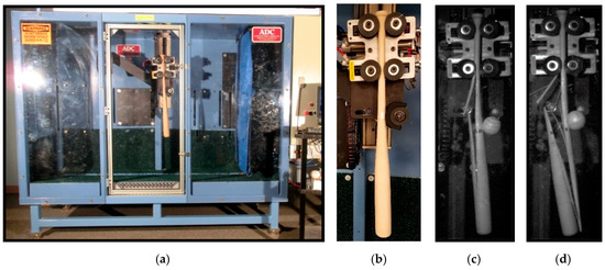 The UMLBRC uses a Bat Durability System (Automated Design Corporation, Romeoville, IL, USA) (Figure 5a,b) to investigate bat durability. Two pairs of compliant rollers hold a stationary bat and simulate the grip of the batter. At the knob end, the top set of rollers are firm to hold the bat in place while the bottom roller set is soft rubber and is loosely touching the bat handle. Previous work concluded that this setup in the Bat Durability System was representative of a player’s grip of the baseball bat in the field [14]. A burp air cannon shoots baseballs toward the bat at speeds up to 200 mph (322 kph). The position of the bat can be raised or lowered such that the bat/ball impact can be programmed to occur anywhere along the length of the bat. A typical bat durability test commences with a speed known to be below the bat breaking speed for the axial position of interest, e.g., a hit on the taper that is 14.0 in. (35.6 cm) from the tip of the barrel (inside-pitch condition). The speed is then increased in increments of ~5 mph (~8 kph) on each subsequent hit. The test ends after the bat breaks, and the speed that induced either the MPF or SPF is used to quantify the bat durability. For this investigation, fatigue effects do not need to be considered because the bat breaking occurs within a range of 1 to 15 impacts. A detailed description of the bat durability testing process is given in Ruggiero et al. [15,16].