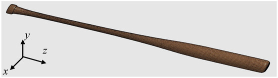 The combination of (1) setting the allowable range for SoG to be ±3°, (2) changing the impact surface from the edge to face grain for maple, and (3) the restriction on the minimum allowable wood density of 0.0245 lb/in3 (678 kg/m3) for the wood species of maple resulted in a measurable decrease of ~65% in the MPF rate per game [5]. Of these three changes, the only one that has an option to offer any additional drop in the MPF rate without any increase in bat weight is a further tightening of the allowable SoG from ±3°. To explore if and how a further tightening of the allowable SoG could improve upon the MPF rate, the durability of sets of bats sorted by SoG, e.g., sorted into four SoG groupings, specifically (1) |SoG| ≤ 1°, (2) 1° < |SoG| ≤ 2°, (3) 2° < |SoG| ≤ 3°, and (4) |SoG| > 3°, could be tested in the lab. However, such an approach would be difficult due to the inherent variability of wood and the lack of control over the factors unrelated to SoG, such as density or the ultimate strength of the wood, thereby making it challenging to draw conclusive trends. In addition, it would also be expensive with respect to the large number of bats that would need to be explored for such a study, as well as the time required to characterize the durability of all bats in the study and subsequent examination of all bat failures. An alternative and cost-effective approach is to use the finite element method to investigate how the failure mode changes as a function of SoG for a range of representative on-field relative bat/ball speeds and impact locations [6,7,8].