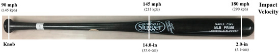 The range of velocities used for this study spanned 90–180 mph (145–290 kph) depending on the impact location of the ball. For the 14.0 in. (35.6 cm) impact model, the velocity range was 90–145 mph (145–233 kph) which corresponds to a 60–100% maximum velocity impact assuming a 90 mph (145 kph) pitch and 90-mph (145 kph) swing speed as measured 2.0 in (5.1 cm) from the tip of the bat rotating about an axis 6.0 in. from the knob to represent the pivot point of the bat in a player’s hands during a swing. Using the same methodology, the 2.0 in. (5.1 cm) impact model set had an expanded velocity range up to 180 mph (290 kph) as this velocity corresponds to a maximum 100% velocity impact at the 2.0 in. (5.1 cm) location assuming a 90 mph (145 kph) pitch and 90 mph (145 kph) swing speed. Figure 9 provides a visualization of the impact locations and the respective maximum impact speed.
