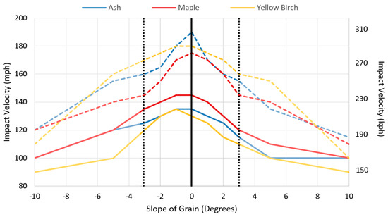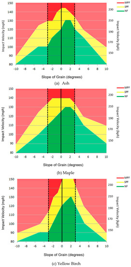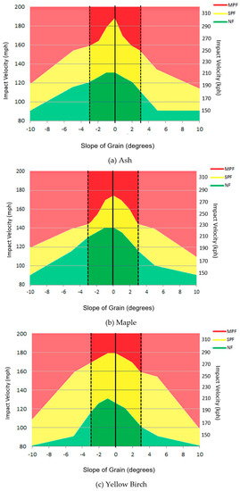 Figure 10 shows that the maximum speed for the NF region for all three wood species when impacted at the 2.0 in. (5.1 cm) location is in the range of SoGs progressing from 0° to −1°, and the breaking speed drops for SOGs on either side of this 1° spread. These results of the outside-pitch 2.0 in. (5.1 cm) impact models imply that the negative-SoG wood for values between 0° and −1° can withstand higher impact velocities before failure than the 0°-SoG wood. The relatively narrow bands of SPF for the maple and ash in comparison to the height of the SPF band for yellow birch imply that ash and maple bats quickly transition from SPF to MPF with less increase in speed than for yellow birch bats. It can also be concluded from the contour areas shown in Figure 10 that using wood with an SoG outside of the range of ±3° for any one of the wood species results in a sharp decrease in bat durability. Thus, the 2.0 in. (5.1 cm) modeling provides virtual scientific data to support the 2008 recommendation that the SoG range be set to ±3°.