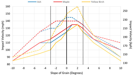 Figure 12 is an overlay plot of the boundaries denoting the transition from NF to SPF (solid lines) and for the transition from SPF to MPF (dashed lines), respectively, for all three wood species when impacted at the 2.0-in. (5.1-cm) location. Figure 12 shows that the yellow birch bats transition from NF to SPF at lower velocities for the entire range of ±10° SoGs in comparison to the maple bats and for most of the range of ±10° SoGs relative to the ash bats. However, Figure 12 also shows that the yellow birch bats had a much higher durability for the transition from SPF to MPF than maple and slightly better than ash. Thus, maple is the most likely of the three wood species to result in an MPF at the high end of the bat/ball impact speeds when viewing the results in the SoG range of ±3°, and this probability of maple breaking in an MPF manner relative to ash and yellow birch increases for SoGs outside the ±2° range. Thus, the modeling implies that the rate of maple bat MPFs due to inside pitches could be measurably reduced if the SoG range for maple were decreased from ±3° to ±2°.