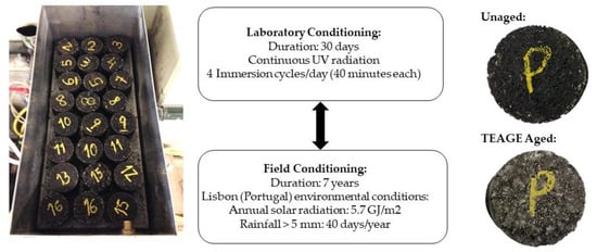 The TEAGE method was used to simulate in the laboratory the ageing of the asphalt mixtures []. Taking into account the historical climate data, TEAGE was tuned to simulate the effects of UV radiation and precipitation that the pavement in service will undergo in the Lisbon region (Portugal) during seven years. According to the Köppen–Geiger climate classification, Lisbon has a temperate dry hot-summer climate (classification Csa) with no freeze–thaw cycles. Thus, the UV radiation and the moisture damage will be important mechanism regarding the ageing of the asphalt pavement. Due to solar radiation, Lisbon receives an average annual energy of 5.7 GJ/m2. Regarding precipitation, Lisbon has in average 40 days per year with rainfall higher than 5 mm. This amount of daily precipitation, 5 mm, is considered to be sufficient to cause a water flow in the pavement surface. The TEAGE prototype uses UV lamps to apply an equivalent level of energy and uses a combination of watering/drying cycles to simulate the effect of precipitation. The duration and details of the ageing conditioning are presented in Figure 4. From Figure 4, the effect of UV radiation on the colouration of the AC mixture specimens is visible.