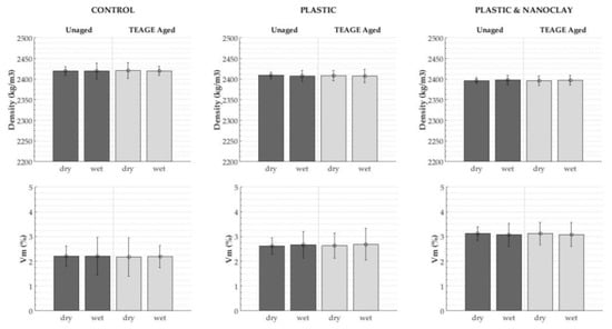 The volumetric characterization is supported by the analysis of the air voids content of each specimen which was determined according to EN 12697-8 []. Figure 5 presents average bulk density values and air voids content (Vm) values for each AC mixture and set of specimens (dry/wet and unaged/aged). The vertical error bar represents the standard deviation of four specimens.