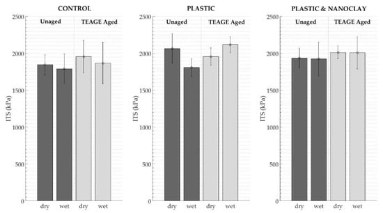 The ITSR of AC mixtures is an indicator of their resistance to moisture susceptibility. However, before presenting ITSR results, average ITS values for each case (AC mixture, dry vs wet, and unaged vs TEAGE aged) are presented in Table 1, depicted in Figure 6 and then discussed.