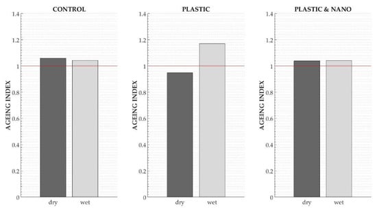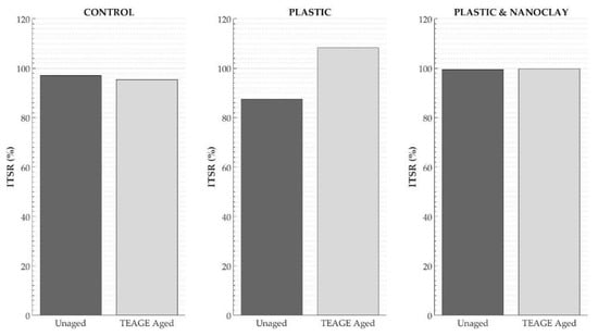 In order to differently appreciate the effect of ageing on ITS values by separating dry and wet samples, an ageing index was calculated. This index is the quotient between the ITS of aged specimens and the ITS of unaged specimens []. Figure 8 shows the results.