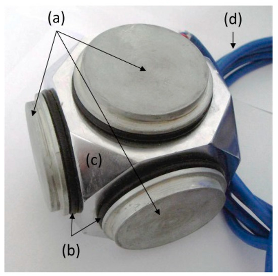 External view of 3D comprehensive stress transducer ((a). sensor faces; (b). sealing washer; (c). supporting body; (d). cable).