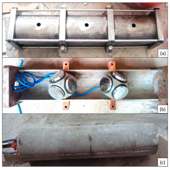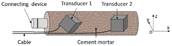 As shown in Figure 9, two transducers were grouted in cement mortar using the developed steel mold to produce a sensing column before the test. During the process, a release agent was first brushed onto the mold surface. Two transducers were placed in the mold with different orientations and the connection devices were fixed in the side hole of the mold. The cap of the mold then was closed tightly with bolts and the cement mortar was injected into the mold. The sensing column was demolded after 24 h and maintained for 28 days in wet steam. Since the mechanical properties of cement mortar should be consistent with those of the rock mass, the grade of cement mortar was chosen as M20 or M10, based on the mechanical parameters of the rock shown in Table 1. The detail ratios of cement mortar and the parameters of the grouted specimens obtained from the uniaxial compression test are presented in Table 2.