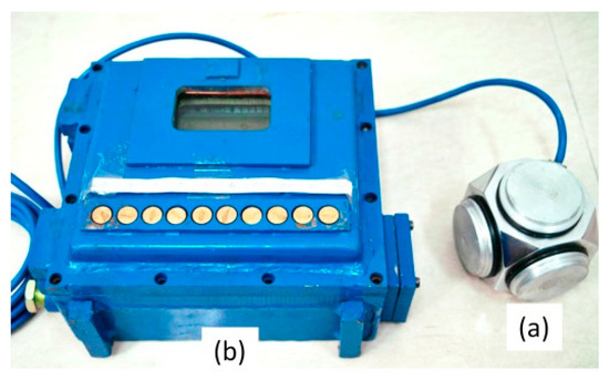 Further, the measuring instruments for the 3D compressive stress sensors, including installing equipment and data acquisition instrumentation, were also developed. The installing equipment is used to push the sensing column and record the burying depth and rotation angle during the installation procedure. As shown in Figure 3, the equipment consists a pushing rod, a three-dimensional roller and a goniometer. The pushing rod includes two alternative lengths (1 m and 1.5 m) of hollow bar made of stainless steel or aluminum alloy. The pushing rod also can be used as the grouting pipe when necessary. The three-dimensional roller is 130 mm in diameter and it is installed in front and between the pushing rods. The goniometer is connected to the transducer column via the front-end rabbet and the instrument displays the angle with the vertical direction during pushing of the sensing column. The function of the data acquisition instrument is to display and store digital signals that are converted from the analog transducer data. Note that electronic productions are not safe in some underground engineering because the existence of gas, especially in a deep coal mine. Therefore, an explosion-proof data acquisition instrument was developed to satisfy the application requirements for using in coal mines (as shown in Figure 4). The explosion-proof data acquisition instrument has a Chinese National explosion-proof certificate and can output many kinds of digital signal, such as temperature, voltage, current, resistance, bridge, and strain, etc.