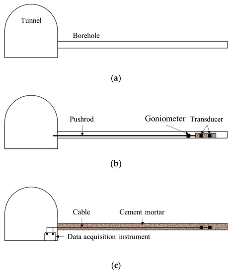 Recently, more and more underground engineering with characteristics of long and deep burial will be built in deep, soft surrounding rock areas [1,2,3,4,5,6]. In situ stress measurement in these areas is essential to determine the mechanical properties of fractured rock masses, analyze the stability of underground structures (e.g., tunnels, caverns, shafts, and other openings), and design the rock support system [7,8,9]. At present, two in situ stress monitoring methods, namely hydraulic fracturing and overcoring [10,11], are widely used in many fields and have obtained acceptable results. These two methods are generally suitable for hard and intact rock as they are assumed that the rock masses have the characteristics of being homogeneous, continuous, isotropic, and linearly elastic. However, most of surrounding rock masses in underground engineering, especially in deep coal mines, are usually soft, fractured, and show a significant time-dependent behavior [12,13,14]. In consequence, these two commonly used methods are hardly applied not only in terms of the theoretical assumption but in implementing the measurements.