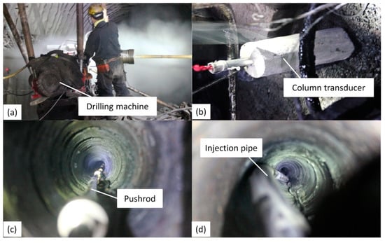Test process for the RSR method in the PDS No. 1 coal mine: (a) Drilling the hole; (b) installing the column transducer; (c) connecting the pushrods; (d) injection pipe for grouting with the cement mortar.
