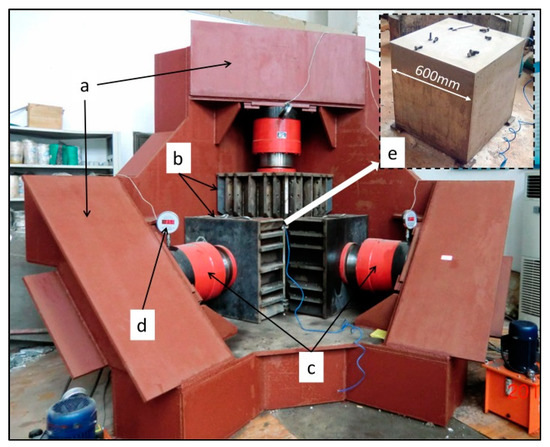 Model tests on a cement mortar body. ((a). steel support frame; (b). steel dowels; (c). hydraulic jack; (d). pressure gauge; (e). cement mortar body with a transducer embedded in the middle).