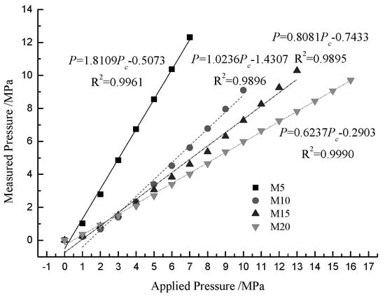 Additionally, the transducer was buried in the cement mortar and the measured stresses are different with the applied or initial stress because the strength difference between transducer and cement mortar. The loading factor LF, which is defined as the ratio of measured stress to the applied stress, was proposed to describe this difference. According to the linear fitting equation between LF and elastic modulus (Figure 13), the value of LF can be calculated for cement mortar with different strength. The results are consistent with the that obtained by Wang et al. [25] for earth pressure sensors. Wang et al. [25] also indicated that the loading factor LF is the parameter only relates to the intrinsic properties of transducer and cement mortar strength and the value of LF can be ignored and the LF obtained from the tests can be used for in situ measurement.